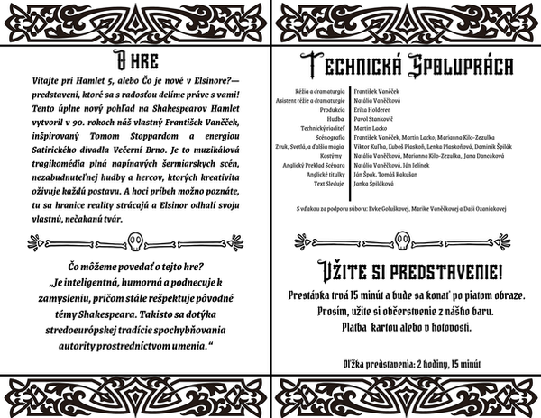 At Naše Divadlo, we take pride in being both Czech and Slovak. For us, it’s important that both identities are represented on stage. That’s why every production is performed simultaneously in Czech and Slovak, with each actor speaking their native language — Hamlet V was no exception.
