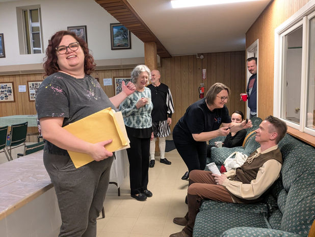 The cast trained intensively to make every duel safe, exact, and visually compelling. Footwork, timing, distance, and trust became core rehearsal language. What might appear effortless on stage required hours of repetition, discipline, and focus, and every actor involved took the challenge seriously. These sessions didn’t just create fights; they built confidence, ensemble awareness, and a shared physical vocabulary that carried through the rest of rehearsals. Following Stage Combat 101, the actors broke for the summer with a clear task: learn lines and retain the physical precision demanded by the fights. Meanwhile, the production team continued shaping the world of Hamlet V, working on sets, props, and costumes to support the action unfolding on stage. When rehearsals resumed in September, the groundwork laid in the spring paid off. Fight scenes could be integrated smoothly into full runs, allowing actors to focus on emotional stakes without sacrificing safety or clarity. As rehearsals moved onto the stage, the fencing sequences gained scale and intensity, becoming some of the production’s most striking moments.